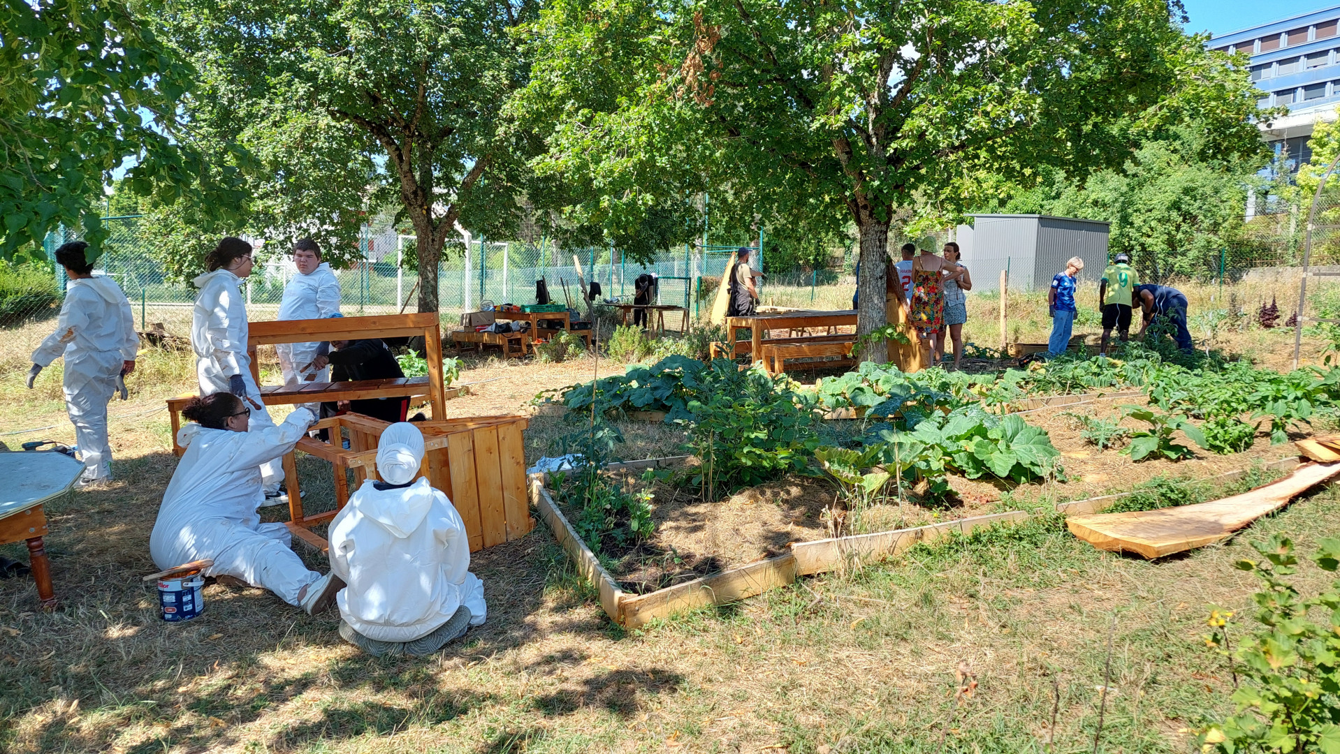 Les parcelles cultivées ont été délimitées par des dosses (planches de bois récupérées en scierie). Cet été, l'EAA a également organisé un des chantiers jeunes de la Ville d'Auxerre au Jardin. Une dizaine de jeunes, aidés par les adultes habitants du quartier, ont ainsi découpé les dosses restantes et les ont installées de manière à renforcer le talus et pouvoir semer des aromatiques sur toute la longueur du jardin. Ils ont aussi lasuré le mobilier réalisé cet hiver avec l'association Au Bonheur des Chutes. Le transat et la table basse ont ainsi trouvé leur place sous l'un des arbres du jardin.